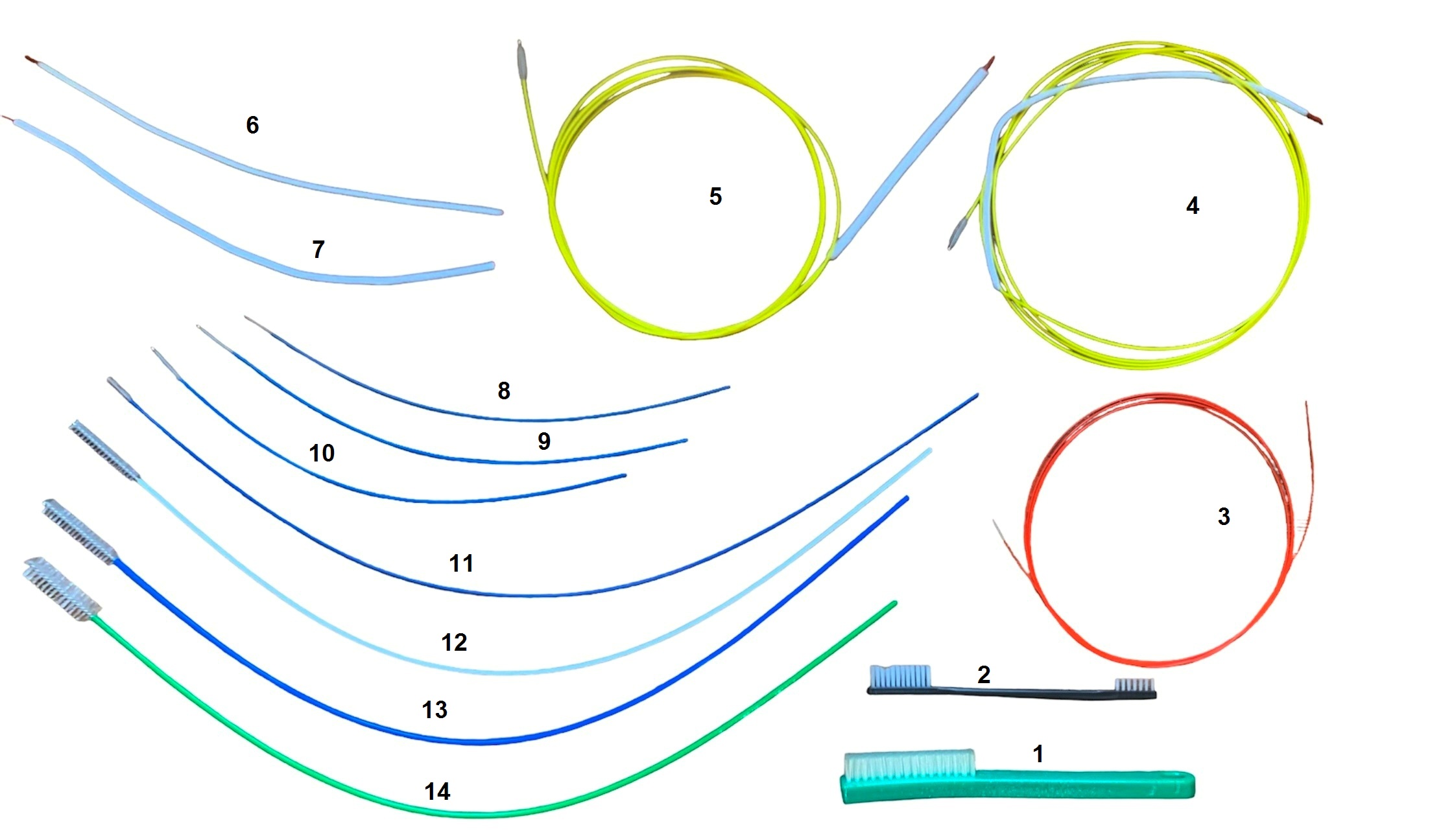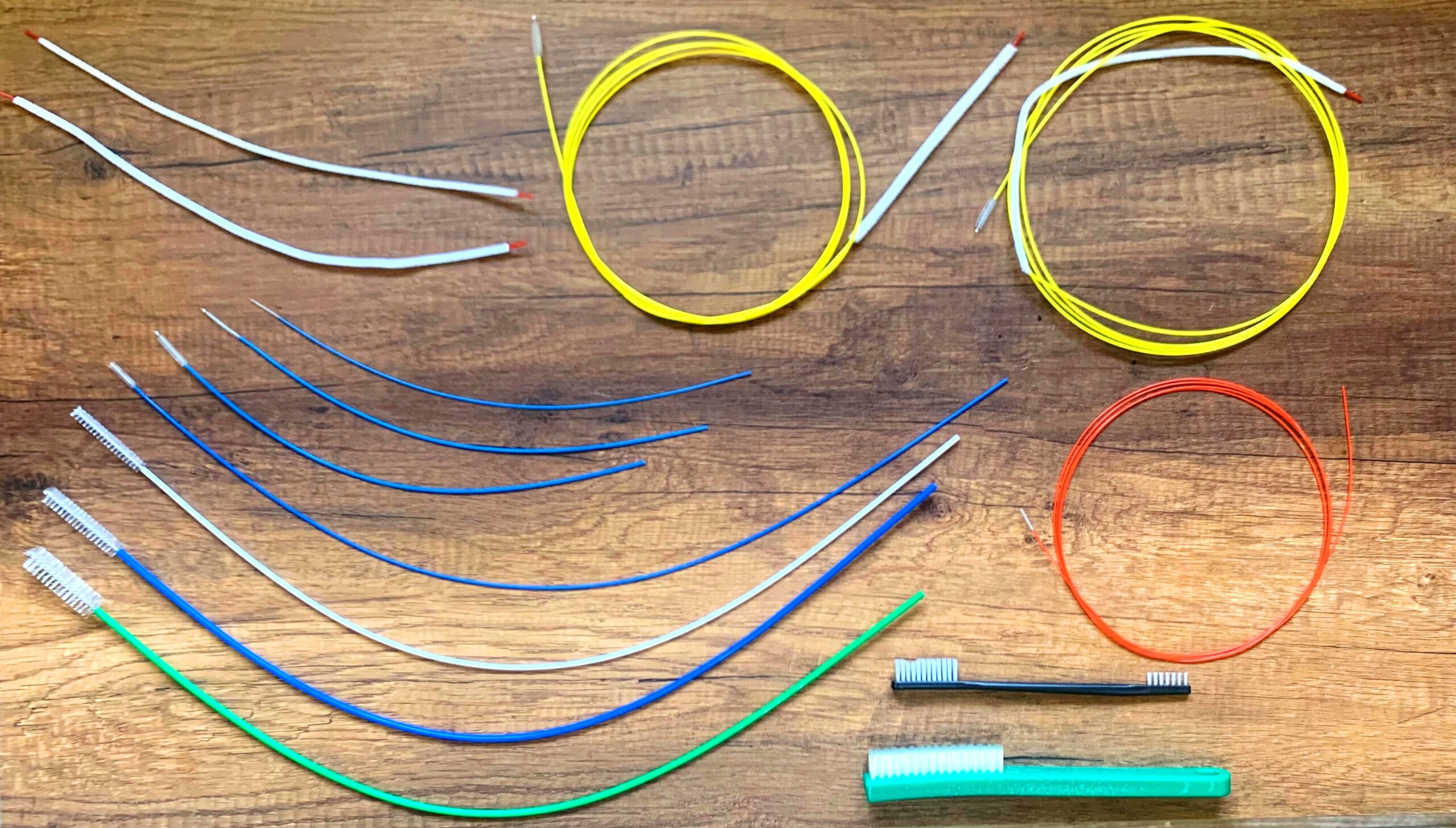 9. კანულის საწმენდი რბილი ჯაგრისი – პლასტმასით დაფარული მავთულის სახელური; 2,5მმx25მმ/1.7 სახელური; სიგრძე 30 სმ